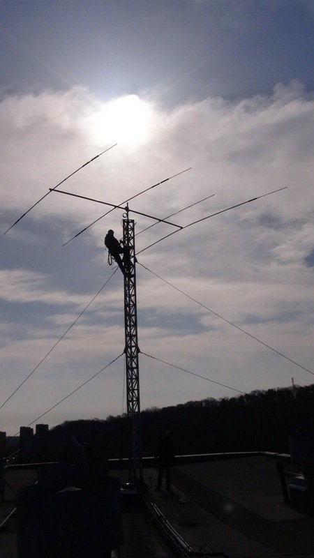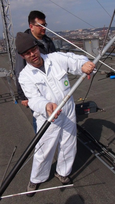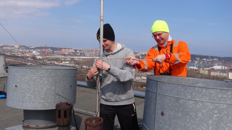 Doszliśmy również do wniosku, że czas zaistnieć na paśmie 1,8 Mhz, a co za tym idzie zrodziła się potrzeba budowy nowej anteny. Jako, że długość fali w tym paśmie wynosi 160m to dipol półfalowy ma każde ramię o długości bagatela 40m. Taka rozpiętość jest więc nie tylko wyzwaniem pod względem konstrukcyjnym (odpowiednio wytrzymałe materiały, a do tego możliwie lekkie) ale również lokalizacyjnym. Mimo, że nasz budynek ma ponad 11 pięter, a odległości między budynkami akademików są dość znaczne, to okazało się, że zawieszenie anteny nie jest tak łatwe jak początkowo liczyliśmy. Nie mniej nie zrażeni problemami lokalizacyjnymi wykonaliśmy antenę z linki miedzianej przy wykorzystaniu baluna produkcji firmy Diamond. Antenę rozwiesiliśmy jako inverted V i uzyskaliśmy całkiem przyzwoity SWR. Zamontowaliśmy również antenę Turnstile SAT-TA1, którą planujemy wykorzystywać do nasłuchów sygnałów satelitarnych i ARISS. Zatem do usłyszenia na nowych pasmach.