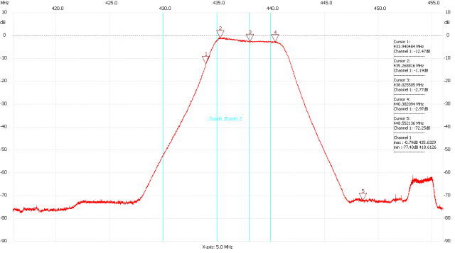 Tłumienie kabla antenowego zależne jest od jego budowy, długości oraz częstotliwości sygnałów które przekazuje. Dlatego też generalnie im stosuje się dłuższe linie i wyższe częstotliwości, tym kabel o lepszych parametrach powinien zostać użyty. Niestety ze względów ekonomicznych oraz konstrukcyjnych nie zawsze można użyć kabli o najlepszych parametrach. W układzie odbiorczym dla wyeliminowania wpływu tłumienia kabla antenowego właściwe jest zainstalowanie przedwzmacniacza antenowego jak najbliżej anteny, dzięki czemu można sobie pozwolić na tłumienie już wzmocnionego sygnału przez kabel antenowy. Każdy wzmacniacz jednak wzmacnia sygnał użyteczny jak i odebrany szum. Dodatkowo jak każdy element generuje też własny szum. Wzmacniacz powinien się cechować jak najmniejszą liczbą szumową, w przeciwnym razie może pogorszyć stosunku sygnał/szum a co za tym idzie odbiór sygnałów. Z języka angielskiego taki wzmacniacz nazywamy LNA – Low Noise Amplifier (wzmacniacz niskoszumowy). Optymalnie wzmacniacz taki powinien wzmacniać sygnały wyłącznie z interesującego nas pasma, być więc wzmacniaczem selektywnym. Najprostszym sposobem uzyskania takiego efektu jest zastosowanie filtra pasmowo-przepustowego w parze ze wzmacniaczem. Zastosowanie filtra pasmowo-przepustowego w projektowanym układzie jest szczególnie ważne w związku z planowanym odbiorem z użyciem tanich, szerokopasmowych SDR. Odbiorniki te nie posiadają praktycznie żadnych filtrów wejściowych. Zgodnie z opisanymi wyżej zasadami wykonany został niskoszumny selektywny wzmacniacz antenowy dla odbioru transmisji satelitarnych w paśmie 70cm. Pierwszym stopniem tego układu jest zaadaptowany filtr pasmowo-przepustowy z modułu RFA-11B. Szczegółowy opis budowy i przestrojenia filtra dostępny jest pod adresem https://lewczuk.pl/krotkofalarstwo-1/strojenie-duplekserow/257-przestrajanie-filtrow-nmt-nokia-dfb11-i-rfa11b-na-pasmo-70cm . Moduł z opisu został dalej zmodyfikowany przez usunięcie części odpowiedzialną za pomiar i wskazywanie dopasowania i dołożenie gniazda SMA w miejsce wejścia tej części. Filtr został następnie przestrojony na odpowiednią częstotliwość. Założeniem było uzyskanie minimalnego tłumienia na częstotliwości odbioru satelity PW-Sat2 (435,275MHz), w miarę jak najwyższego tłumienia sygnałów z częstotliwości poniżej 435MHz oraz małego tłumienia sygnałów z pasma 435MHz-438MHz (pasmo satelitarne). Założenia te uzyskano otrzymując tłumienie dla częstotliwości 435,275MHz rzędu 1,5dB, 433,92MHz – 12,5dB, 438MHz – 2,6dB. Jako wzmacniacz antenowy LNA zastosowany został układ budowy DB6NT / Kuhne electronics BB-3050-A