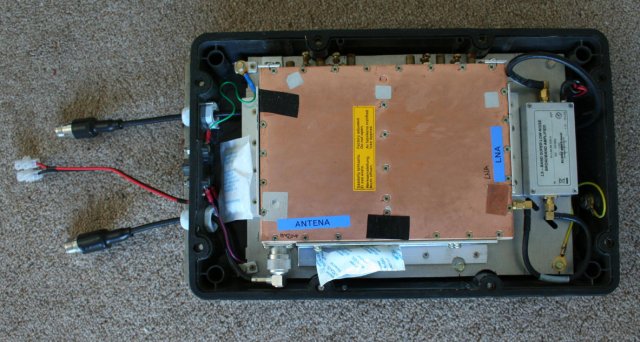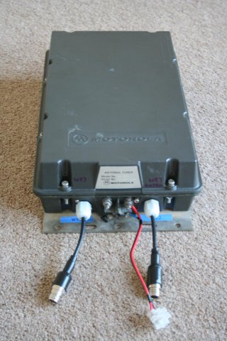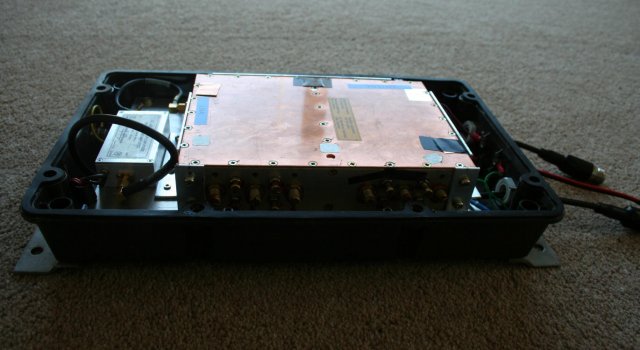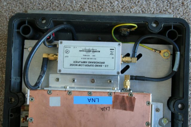 Charakteryzuje się wzmocnieniem około 20dB, liczbą szumową około 1dB. Wzmacniacz ten doskonale znosi nawet bardzo silne sygnały, które nie spowodują interferencji. Zasilany jest napięciem 12V-15V i pobiera dość dużo prądu (około 400mA), generując sporo ciepła, które powinno zostać z obudowy odebrane. Filtr i wzmacniacz zostały przykręcone do blachy albuminowej i połączone krótkimi odcinkami niskostratnego kabla koncentrycznego. Całość została umieszczona w wodoszczelnej obudowie po skrzynce antenowej Motorola F2260A. Umożliwi to bezpieczne umieszczenie na maszcie w bezpośrednim sąsiedztwie anteny odbiorczej.